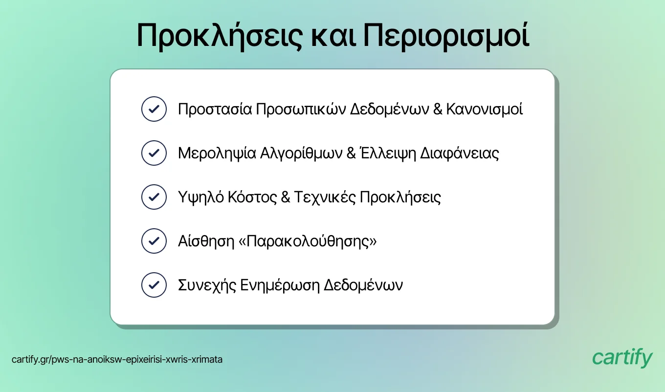 Αυτό μπορεί να είναι απαγορευτικό για μικρές επιχειρήσεις, ειδικά χωρίς έτοιμες λύσεις ή συνεργασίες.