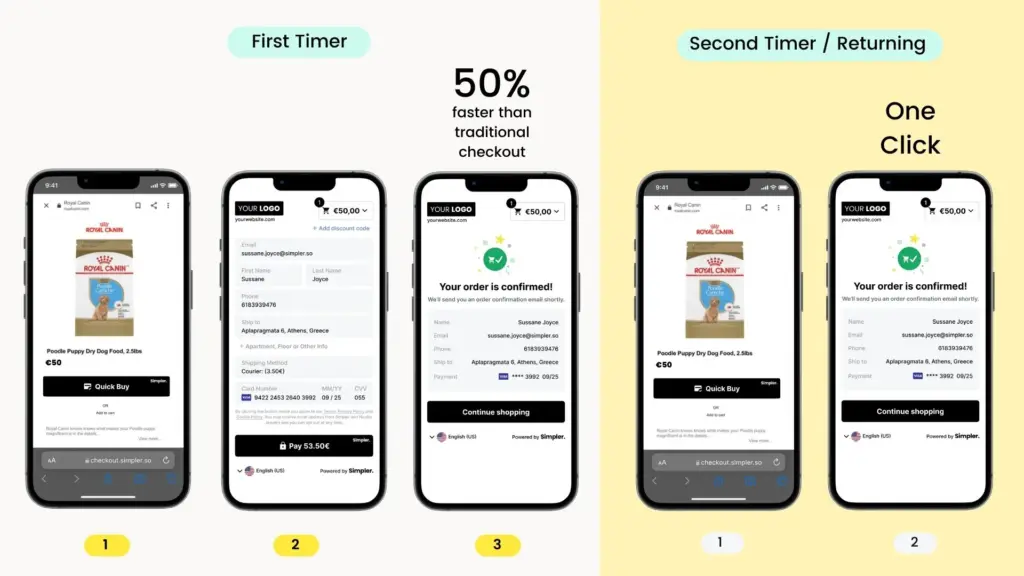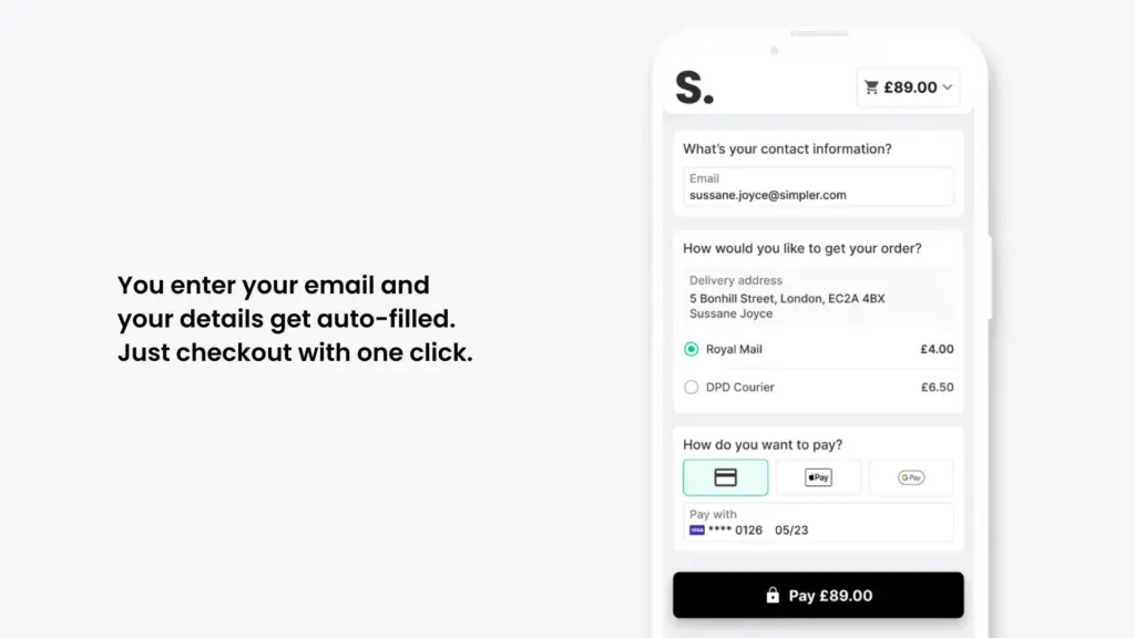 Με τη Simpler, οι πελάτες σας δεν χρειάζεται να συμπληρώνουν ξανά και ξανά τα στοιχεία τους. Αντίθετα, απολαμβάνουν ένα one-click checkout που βελτιώνει την εμπειρία τους και αυξάνει τις ολοκληρωμένες αγορές στο κατάστημά σας.
